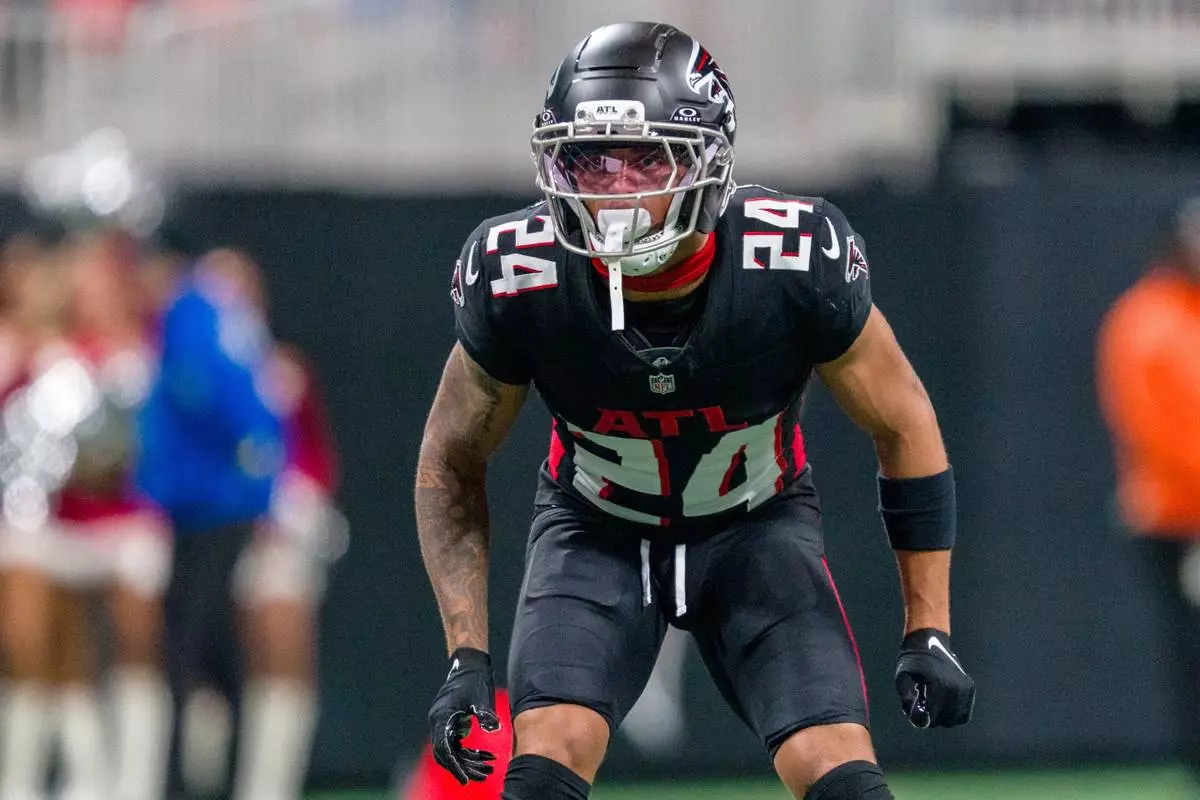 FILE - Atlanta Falcons cornerback A.J. Terrell Jr. (24) lines up during the first half of an NFL football game against the Seattle Seahawks, Sunday, Dec. 7, 2025, in Atlanta. (AP Photo/Danny Karnik, File)