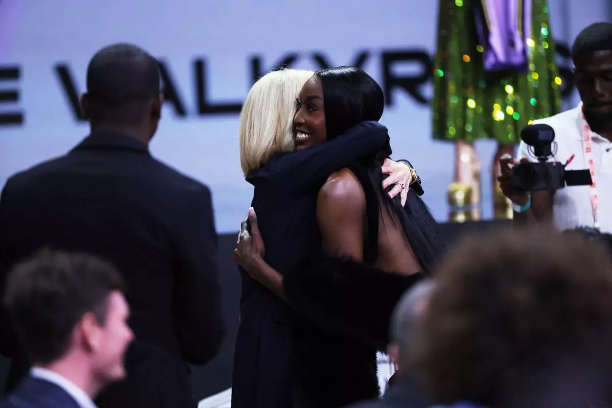 LSU guard Flau'jae Johnson hugs LSU coach Kim Mulkey after being selected eighth overall by the Golden State Valkyries in the first round of the WNBA basketball draft Monday, April 13, 2026, in New York. (AP Photo/Pamela Smith)