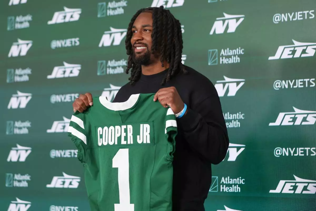 New York Jets first round draft pick, No. 30 overall, Omar Cooper Jr. holds up a jersey during an introductory press conference at the NFL team's training facility, Friday, April 24, 2026, in Florham Park, N.J. (AP Photo/Heather Khalifa)