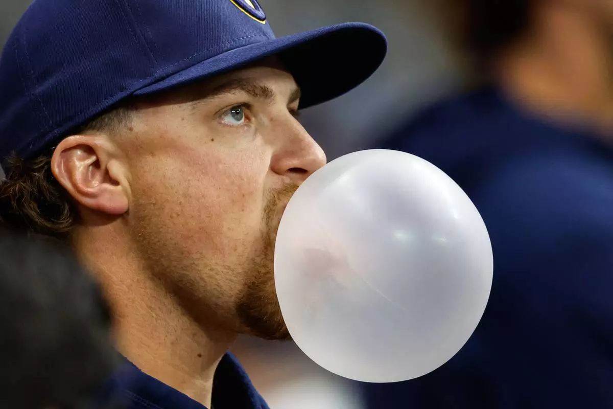 Milwaukee Brewers' Chad Patrick blows a gum bubble in the dugout during the eighth inning of a baseball game against the Pittsburgh Pirates, Saturday, April 25, 2026, in Milwaukee. (AP Photo/Jeffrey Phelps)