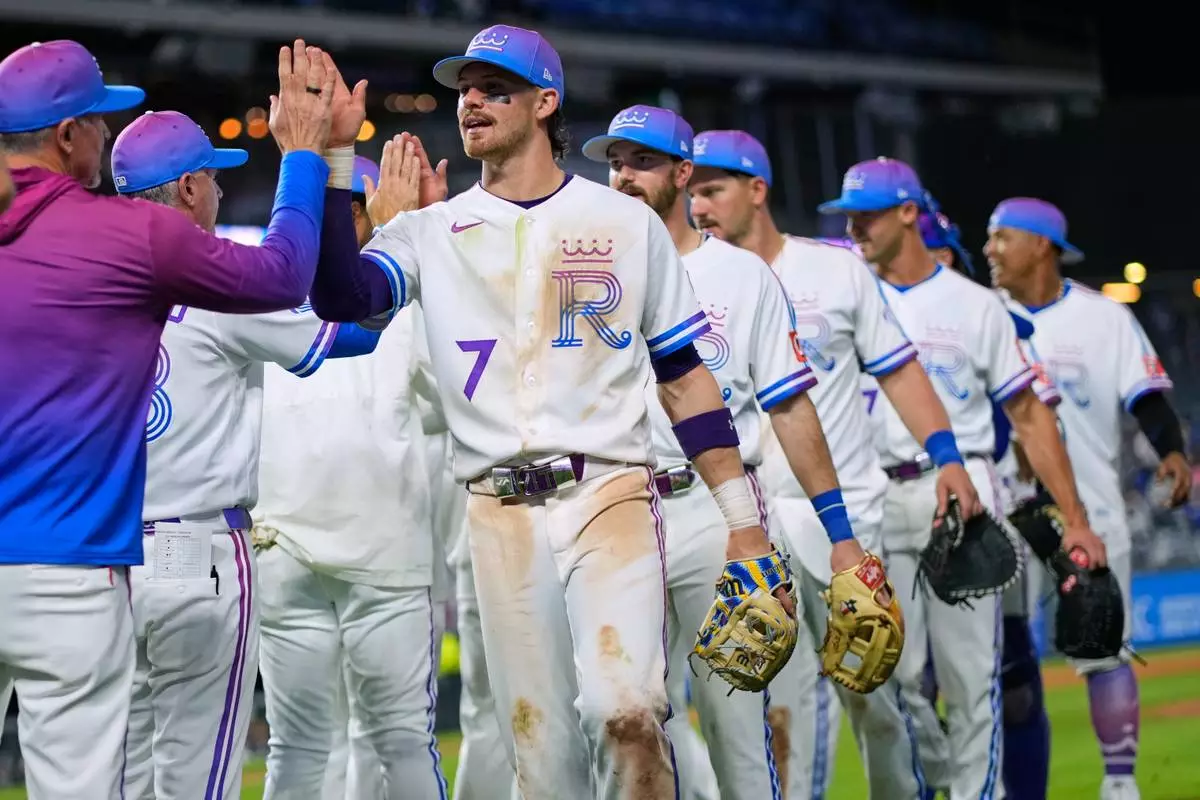 Kansas City Royals' Bobby Witt Jr. (7) celebrates with teammates after their baseball game against the Los Angeles Angels, Saturday, April 25, 2026, in Kansas City, Mo. (AP Photo/Charlie Riedel)