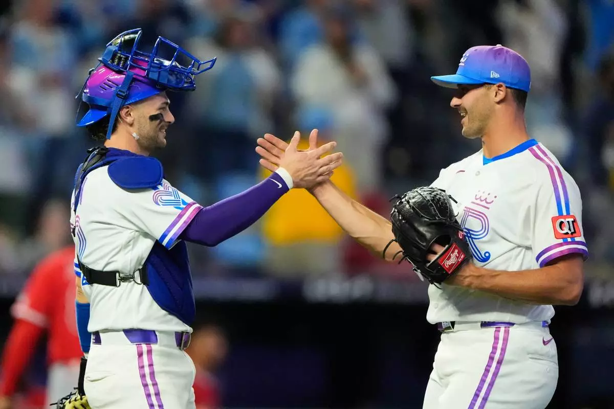 Kansas City Royals catcher Carter Jensen, left, and relief pitcher Mason Black celebrate after their baseball game against the Los Angeles Angels, Saturday, April 25, 2026, in Kansas City, Mo. (AP Photo/Charlie Riedel)