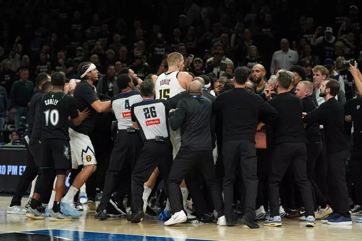 Minnesota Timberwolves and Denver Nuggets players get into an altercation during the second half of Game 4 of a first-round NBA basketball playoff series, Saturday, April 25, 2026, in Minneapolis. (AP Photo/Abbie Parr)