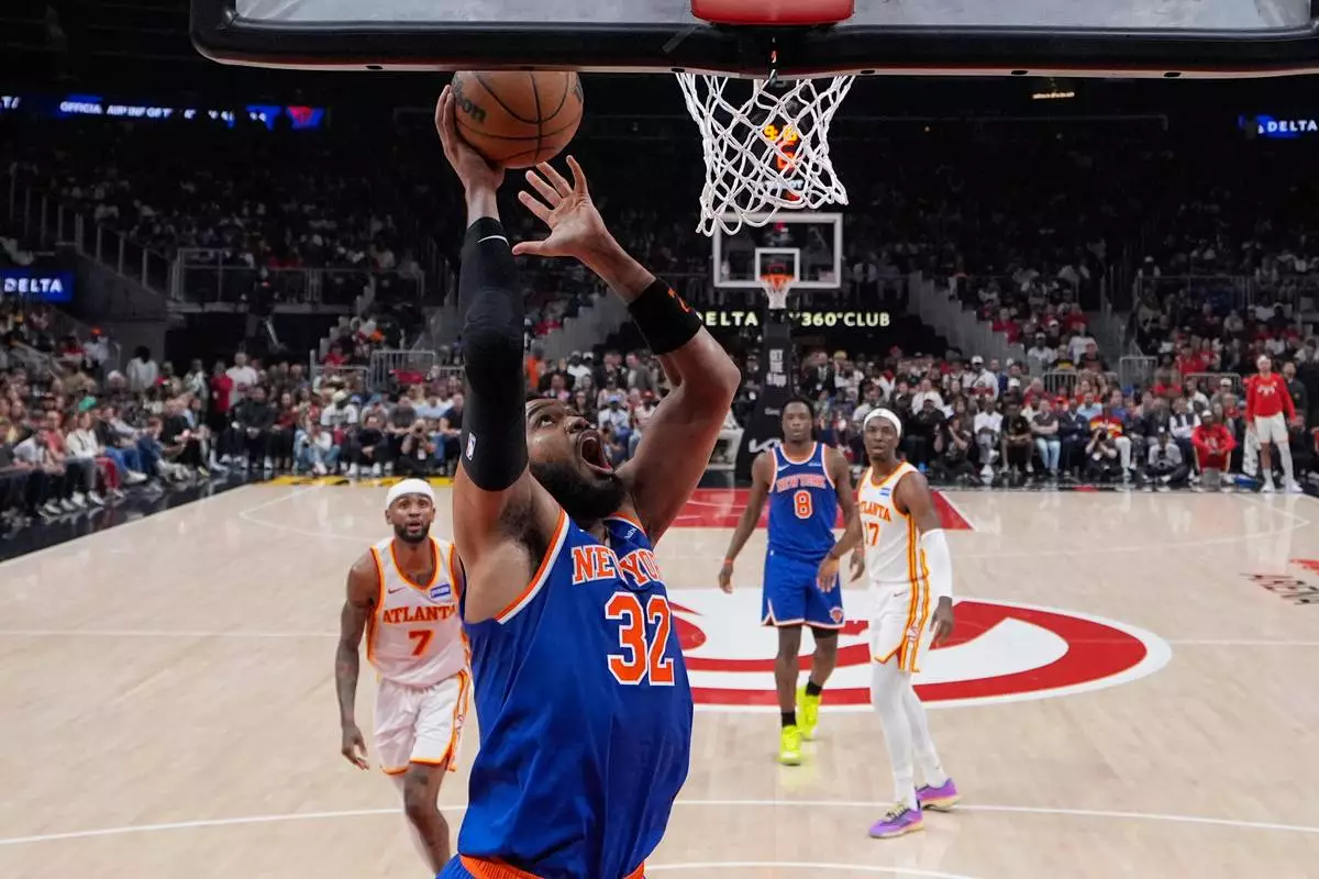 New York Knicks center Karl-Anthony Towns (32) scores during the first half of Game 4 in a first-round NBA playoffs basketball series against the Atlanta Hawks Saturday, April 25, 2026, in Atlanta. (AP Photo/Brynn Anderson)