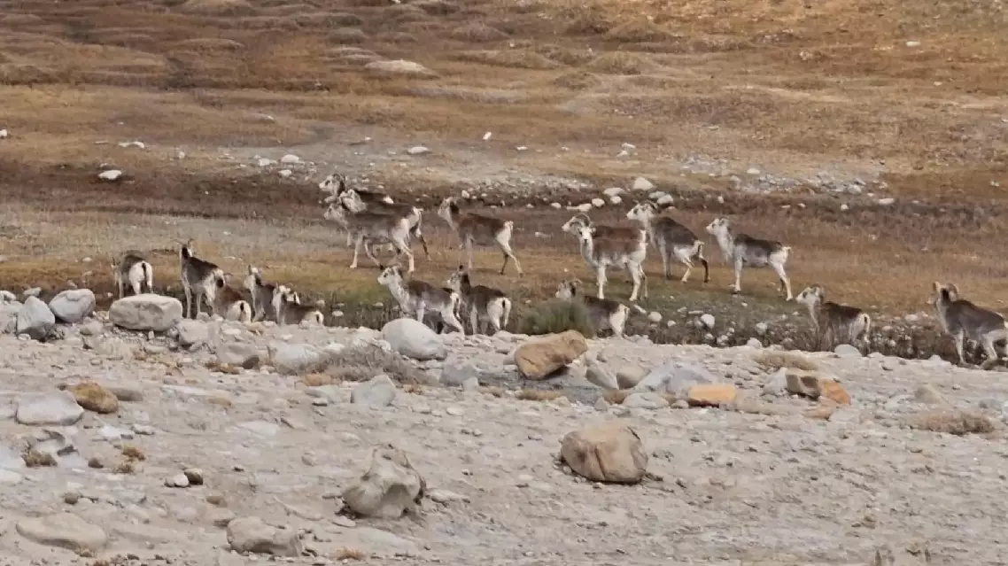 A herd of Marco Polo sheep was spotted Thursday grazing at the foot of Mount Muztagata in Xinjiang, marking a rare sighting of the iconic species in its high-altitude habitat.