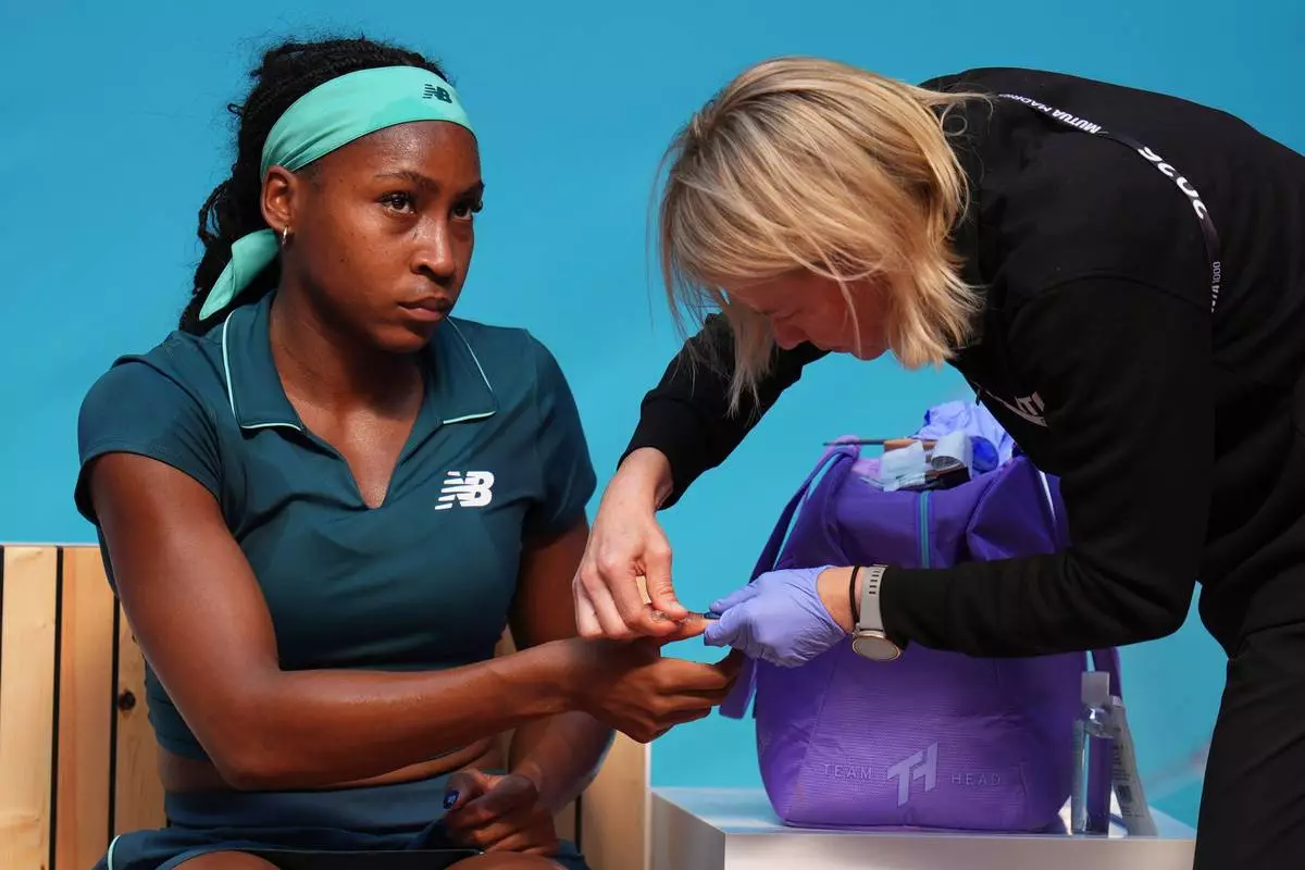 Coco Gauff of the U.S. receives medical attention during her match against Leolia Jeanjean of France during the Madrid Open tennis tournament in Madrid, Friday, April 24, 2026. (AP Photo/Manu Fernandez)