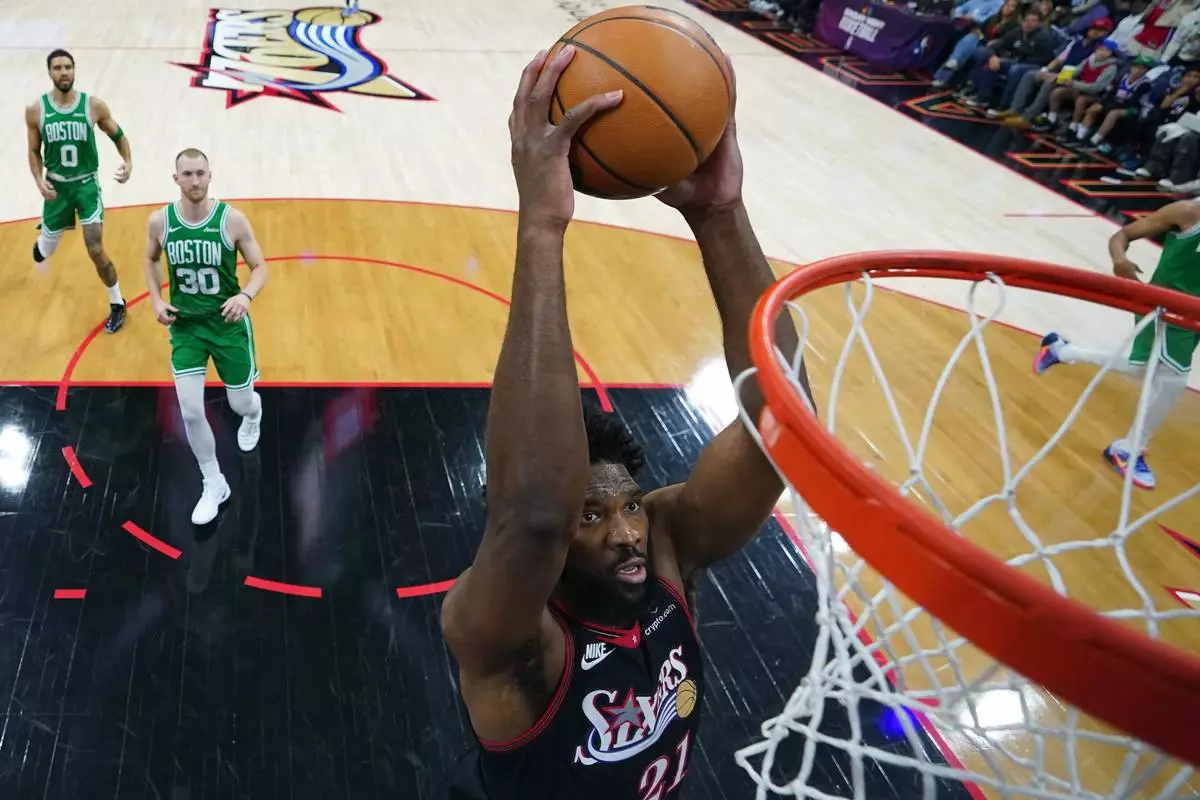 Philadelphia 76ers' Joel Embiid goes up for a dunk during the first half of Game 4 against the Boston Celtics in a first-round NBA basketball playoffs series Sunday, April 26, 2026, in Philadelphia. (AP Photo/Matt Slocum)