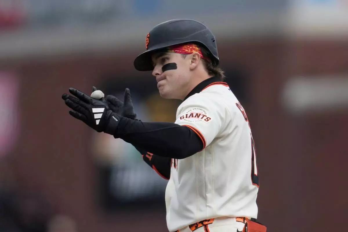 San Francisco Giants' Drew Gilbert gestures after hitting an RBI single during the sixth inning of a baseball game against the Miami Marlins Sunday, April 26, 2026, in San Francisco. (AP Photo/Jeff Chiu)