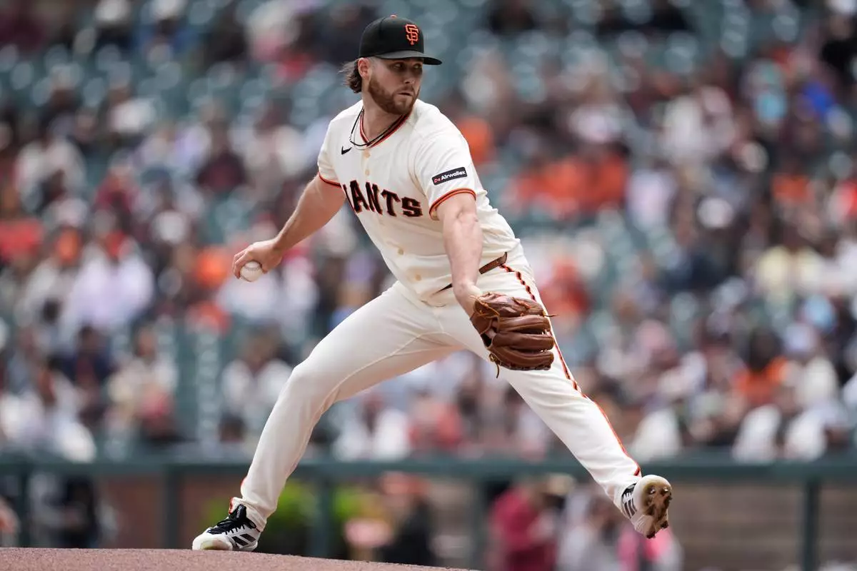 San Francisco Giants pitcher Landen Roupp throws against the Miami Marlins during the first inning of a baseball game Sunday, April 26, 2026, in San Francisco. (AP Photo/Jeff Chiu)