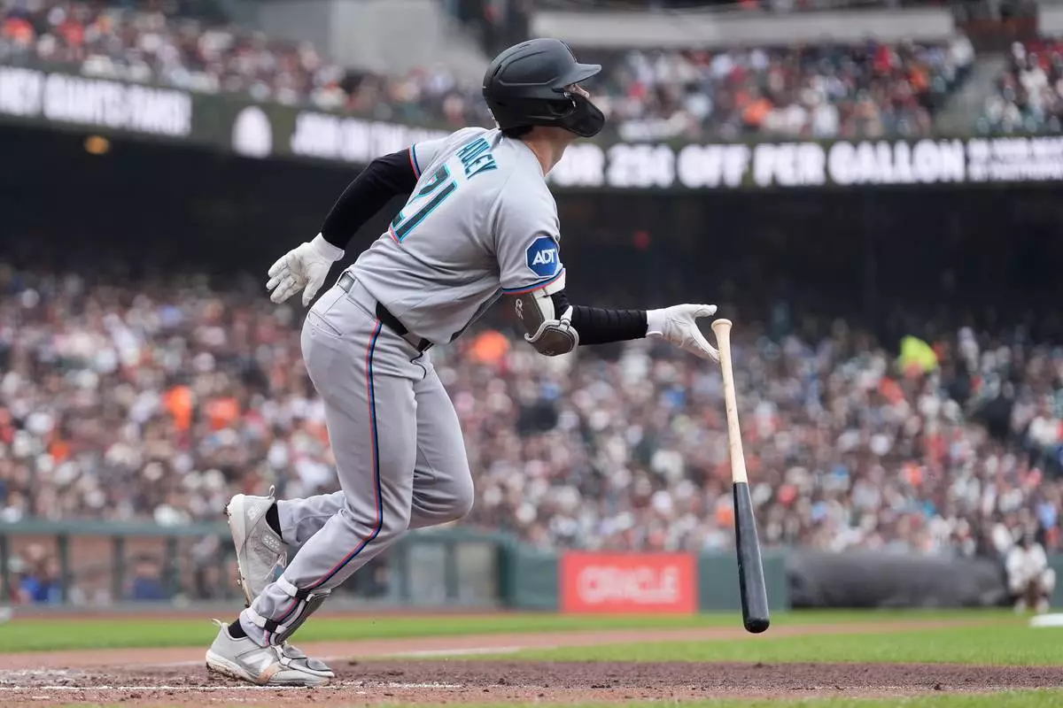 Miami Marlins' Graham Pauley watches his three-run home run against the San Francisco Giants during the second inning of a baseball game Sunday, April 26, 2026, in San Francisco. (AP Photo/Jeff Chiu)