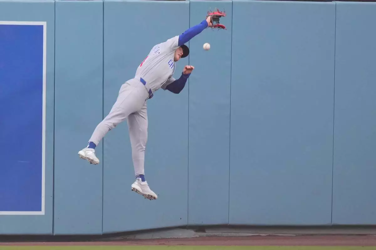 Chicago Cubs center fielder Pete Crow-Armstrong can't get to a ball hit for a double by Los Angeles Dodgers' Alex Freeland during the fifth inning of a baseball game Saturday, April 25, 2026, in Los Angeles. (AP Photo/Mark J. Terrill)