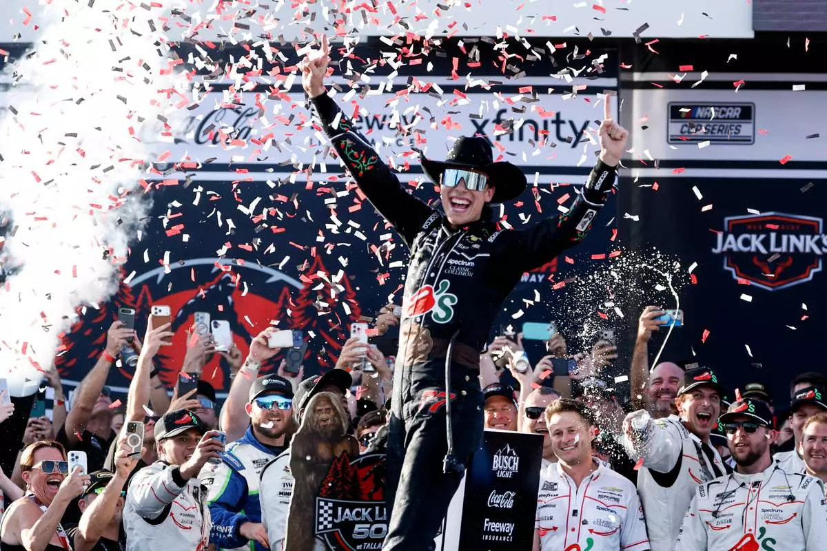 After outdueling Chris Buescher with a last-lap pass Sunday, Hocevar celebrated with one of NASCAR’s most unconventional victory laps. While sitting on the windowsill of his No. 77 Chevrolet to salute the crowd with fist pumps and waves, the lanky Hocevar managed to keep his left hand on the wheel while driving down the frontstretch.
