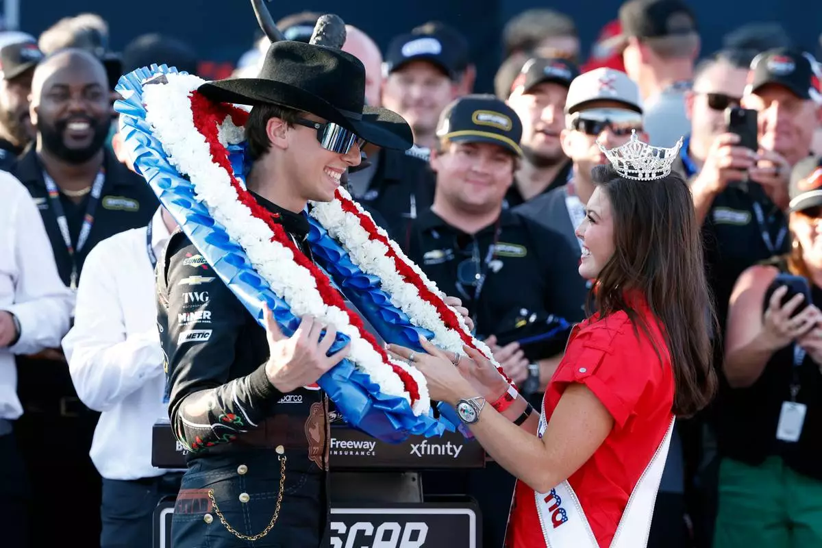 Carson Hocevar is presented a wreath from Miss Alabama Hailey Adams after winning a NASCAR Cup Series auto race, Sunday, April 26, 2026, in Talladega, Ala. (AP Photo/Butch Dill)