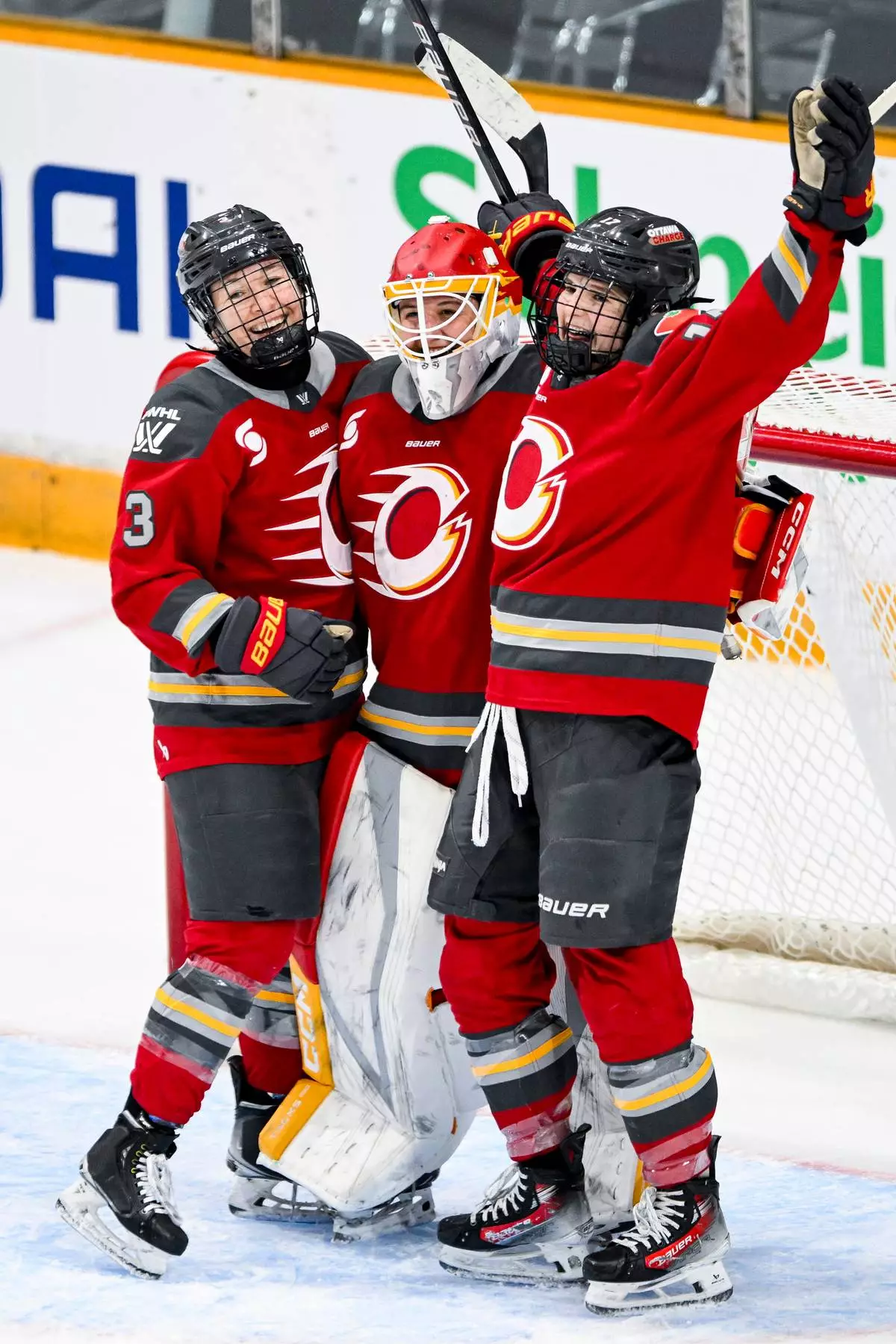 Ottawa Charge's Jocelyne Larocque (3), goaltender Gwyneth Philips (33) and Gabbie Hughes (17) celebrate their team's win over the Toronto Sceptres after a PWHL hockey game in Ottawa, Ontario, Saturday, April 25, 2026. (Spencer Colby/The Canadian Press via AP)