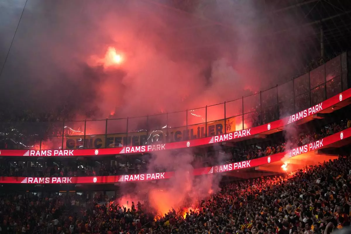 Fenerbahce's supporters light flares during a Turkish Super Lig soccer match between Galatasaray and Fenerbahce in Istanbul, Turkey, Sunday, April 26, 2026. (AP Photo/Emrah Gurel)