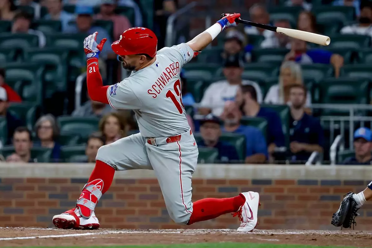 Philadelphia Phillies designated hitter Kyle Schwarber (12) strikes out with men on base against the Atlanta Braves during the ninth inning of a baseball game, Friday, April 24, 2026, in Atlanta. (AP Photo/Erik S. Lesser)