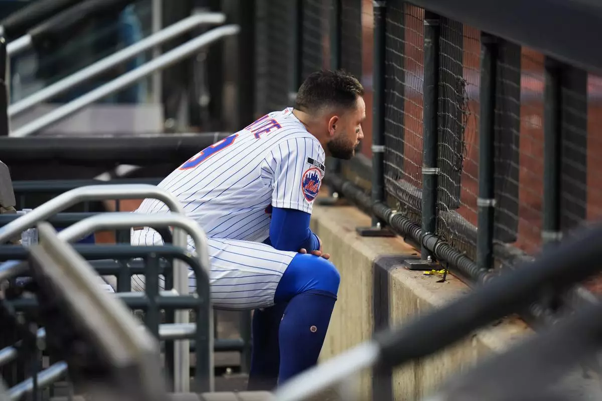 New York Mets' Bo Bichette sits in the dugout after the second baseball game of a doubleheader against the Colorado Rockies, Sunday, April 26, 2026, in New York. (AP Photo/Seth Wenig)