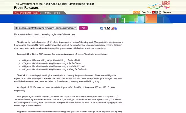 The Centre for Health Protection (CHP) of the Department of Health (DH) today (April 27) reported the latest number of Legionnaires' disease (LD) cases, and reminded the public of the importance of using and maintaining properly designed man-made water systems, adding that susceptible groups should strictly observe relevant precautions.