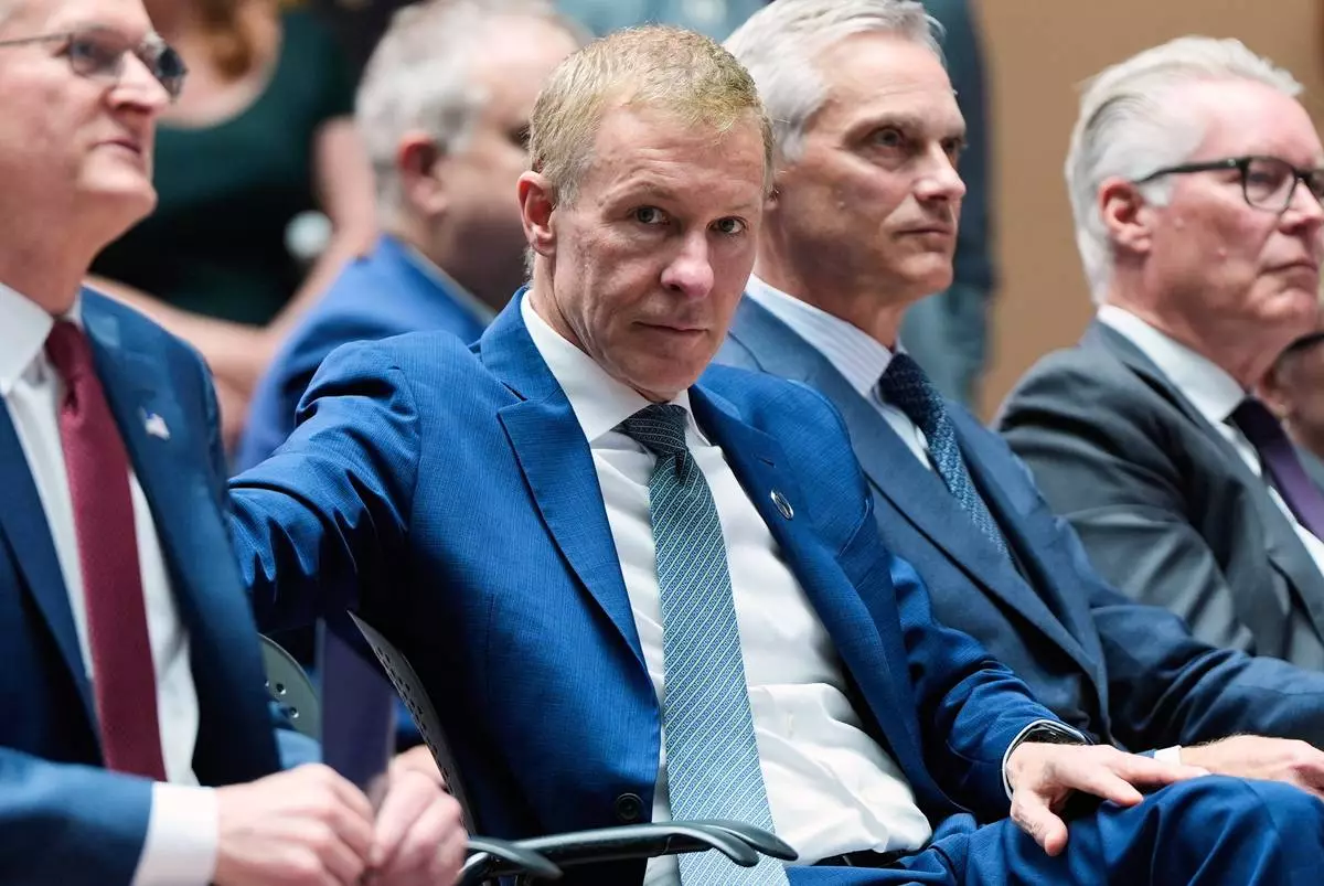 FILE - Scott Kirby, second left, CEO of United Airlines, and Robert Isom, second right, CEO of American Airlines, listen as Transportation Secretary Sean Duffy announces a new air traffic control infrastructure plan, Thursday, May 8, 2025, in Washington. (AP Photo/Julia Demaree Nikhinson, File)