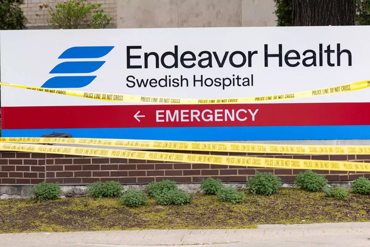 Tape covers the area outside of Endeavor Health Swedish Hospital in Chicago, Saturday, April 25, 2026, after a shooting. (Anthony Vazquez/Chicago Sun-Times via AP)