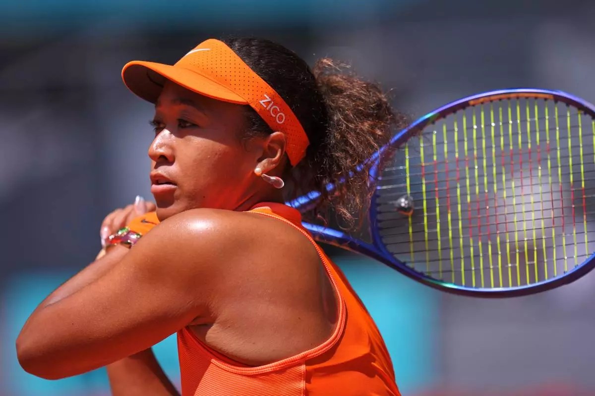 Naomi Osaka of Japan returns the ball to Aryna Sabalenka of Belarus during the Madrid Open tennis tournament in Madrid, Monday, April 27, 2026. (AP Photo/Manu Fernandez)