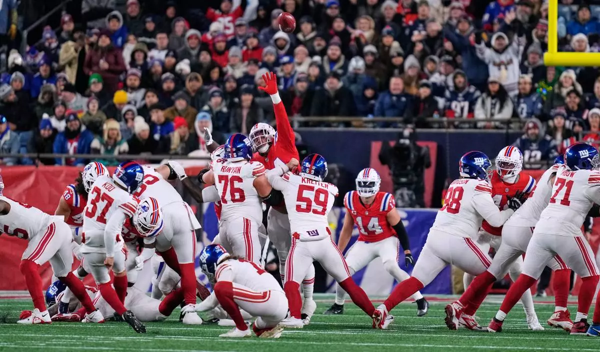 New York Giants kicker Younghoe Koo (37) kicks during the first half of an NFL football game against the New England Patriots, Monday, Dec. 1, 2025, in Foxborough, Mass. (AP Photo/Charles Krupa, File)