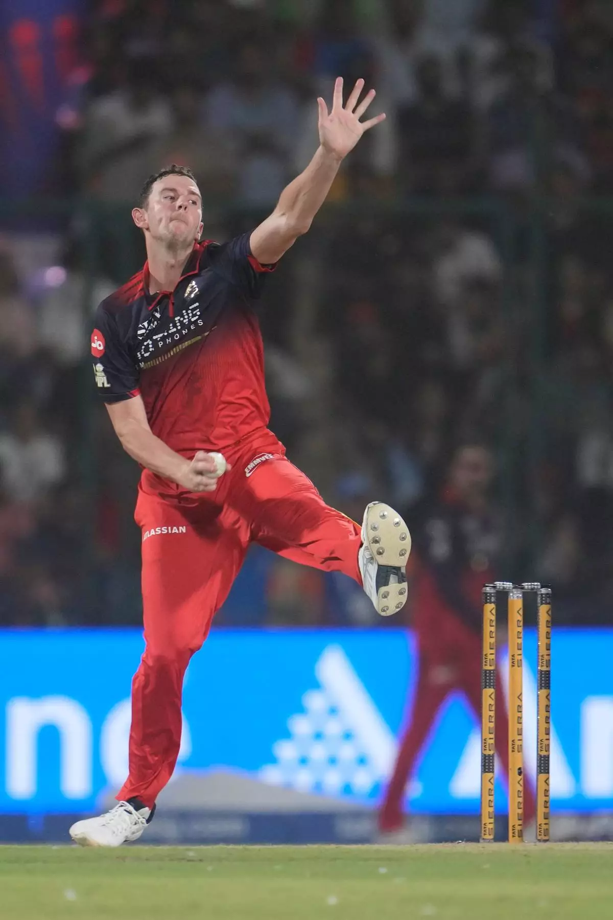 Royal Challengers Bengaluru's Josh Hazlewood bowls a delivery during the Indian Premier League cricket match between Delhi Capitals and Royal Challengers Bengaluru in Delhi, India, Monday, April 27, 2026. (AP Photo/Manish Swarup)