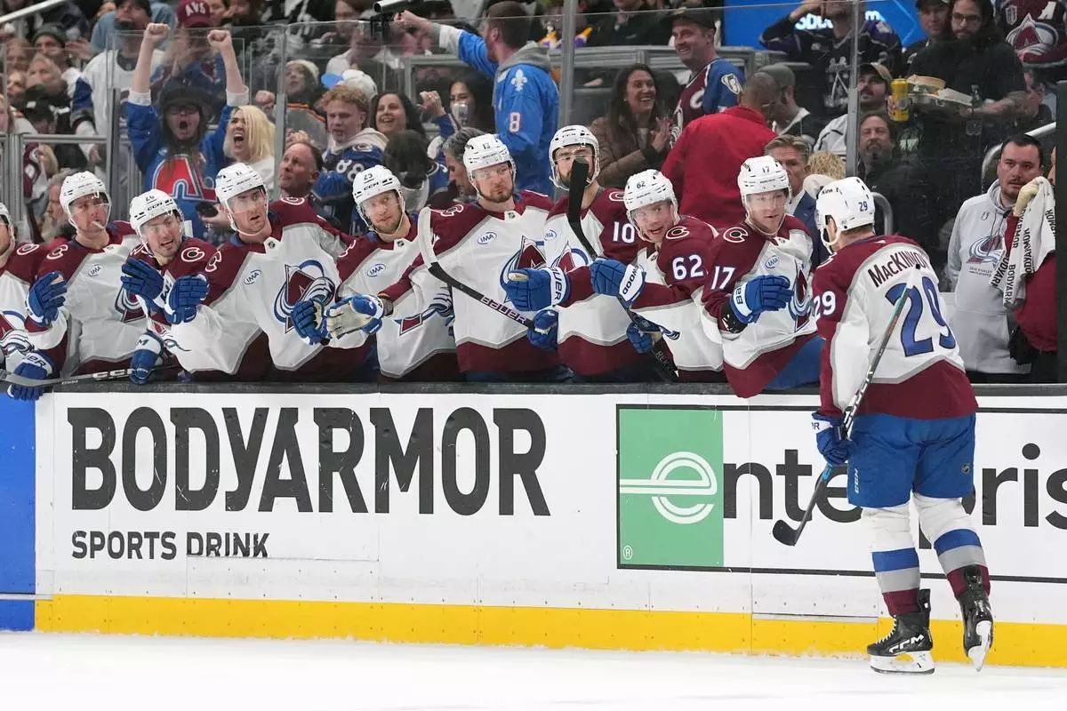The Colorado Avalanche's bench greets Nathan MacKinnon (29) after MacKinnon's goal against the Los Angeles Kings during the first period of Game 4 in the first round of an NHL hockey Stanley Cup playoff series Sunday, April 26, 2026, in Los Angeles. (AP Photo/Scott Strazzante)