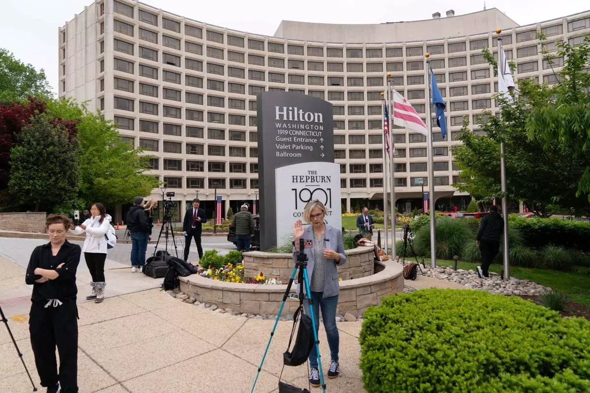 Journalists gather outside of the Washington Hilton Hotel, Sunday, April, 26, 2026, in Washington, the day after a gunman tried to storm into the hotel's ballroom during the White House Correspondents' Dinner. (AP Photo/Jose Luis Magana)