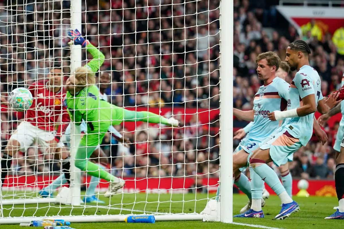 Brentford's goalkeeper Caoimhin Kelleher fails to save first goal during the Premier League soccer match between Manchester United and Brentford in Manchester, England, Monday, April 27, 2026. (AP Photo/Dave Thompson)