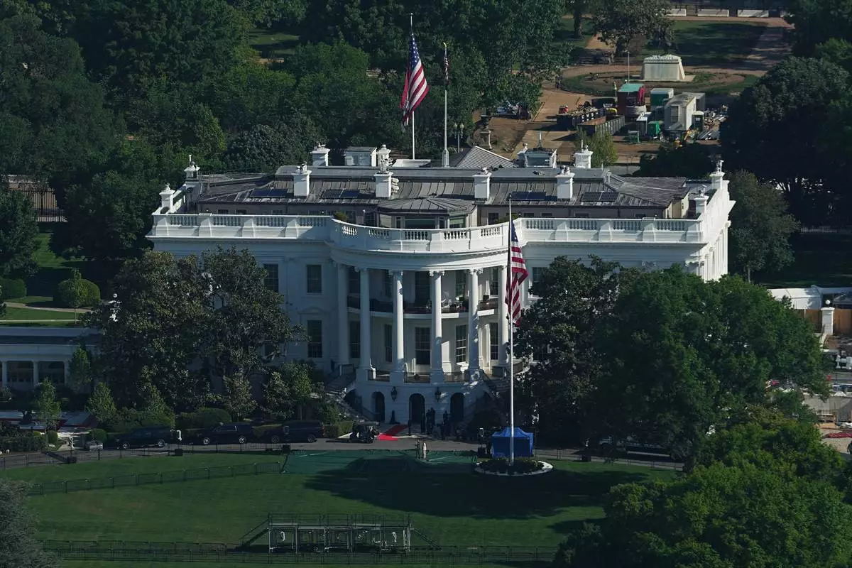 The White House is seen from the Washington Monument, Monday, April 27, 2026, in Washington. King Charles III and Queen Camilla arrive in the U.S. today for a four-day state visit aimed at celebrating the United States' 250th anniversary, including a White House state dinner and a speech to Congress. (AP Photo/Matt Rourke)