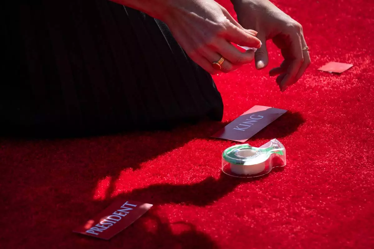 A staff member places tags for Britain's King Charles III and President Donald Trump on the red carpet before the arrival of the Britain's King Charles III and Queen Camilla at the White House, Monday, April 27, 2026, in Washington. (AP Photo/Mark Schiefelbein)