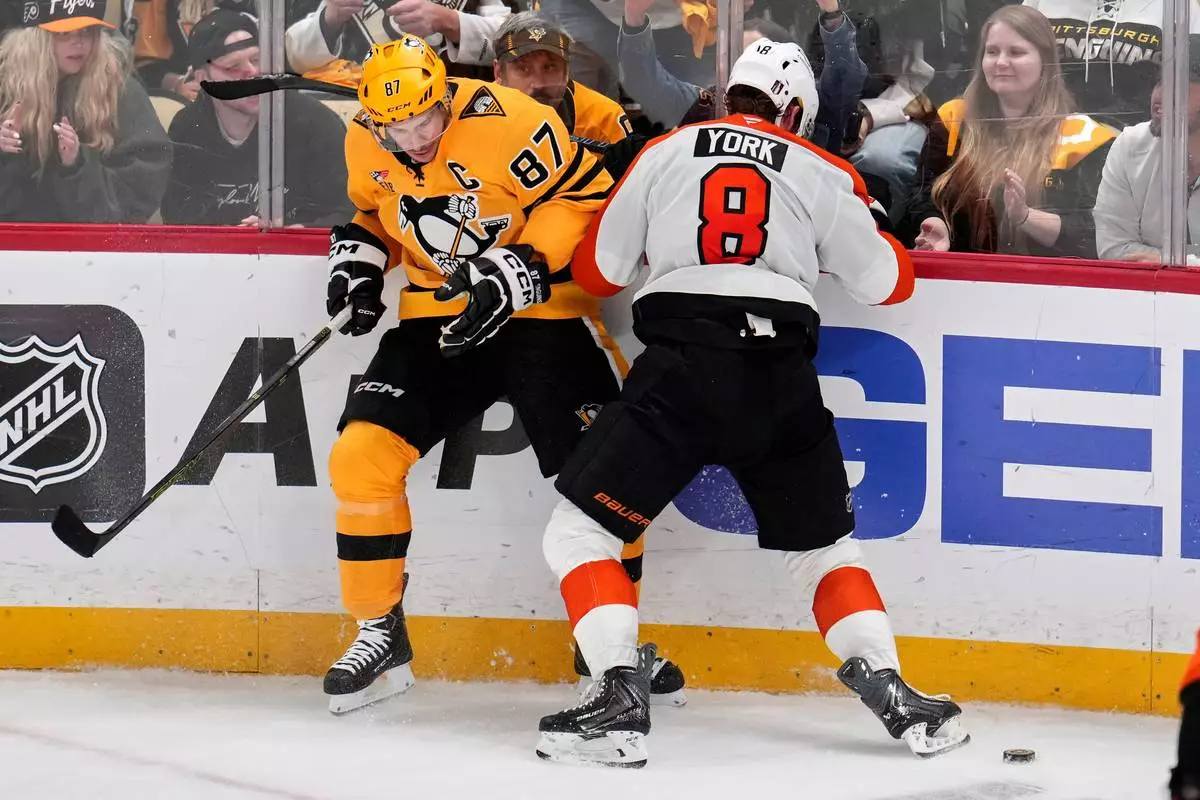 Pittsburgh Penguins' Sidney Crosby (87) is checked off the puck by Philadelphia Flyers' Cam York (8) during the third period of Game 5 in the first round of an NHL hockey Stanley Cup playoff series in Pittsburgh, Monday, April 27, 2026. (AP Photo/Gene J. Puskar)