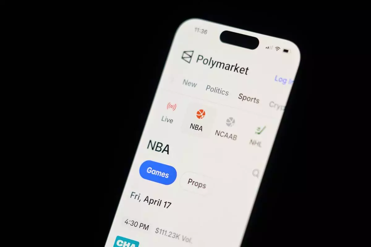 A phone displays sports trades on Polymarket on Thursday, April 16, 2026, in Portland, Ore. (AP Photo/Jenny Kane)