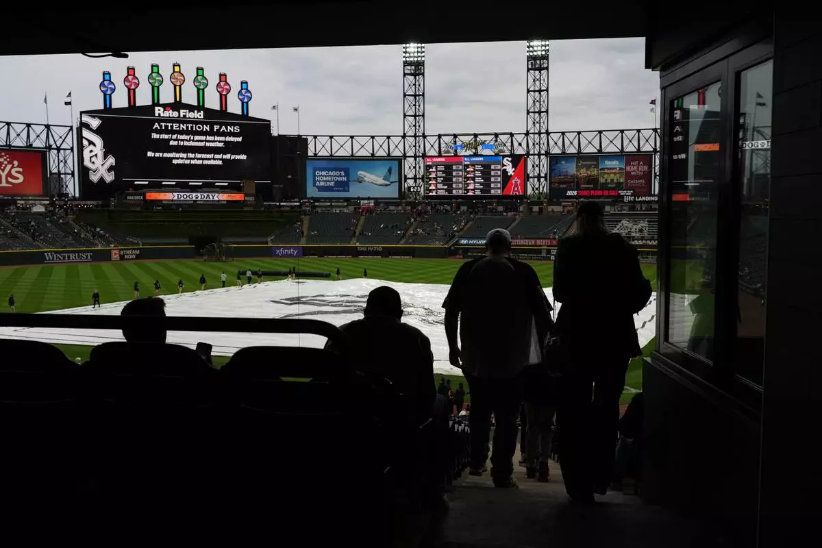 A tarp covers the infield as fans wait during a rain delay before a baseball game between the Los Angeles Angels and the Chicago White Sox in Chicago, Monday, April 27, 2026. (AP Photo/Nam Y. Huh)