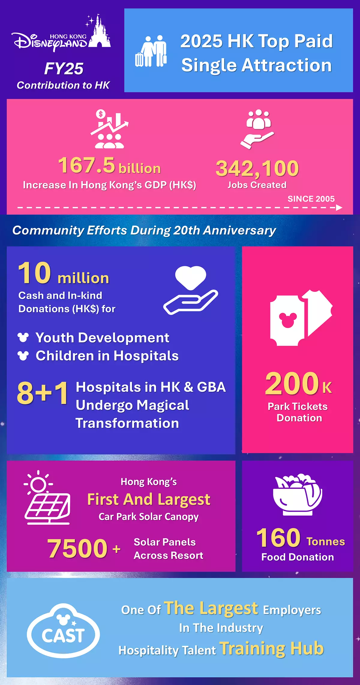 • Key pillar of Hong Kong’s tourism and economy: Taking the past 20 years of operation together, the total value-added to Hong Kong generated by HKDL amounted to HK$167.5 billion. A total of 342,100 jobs were also created for frontline workers and the travel industry, benefiting Hong Kong’s overall economy. In 2025, HKDL continued to be the top paid attraction in Hong Kong.