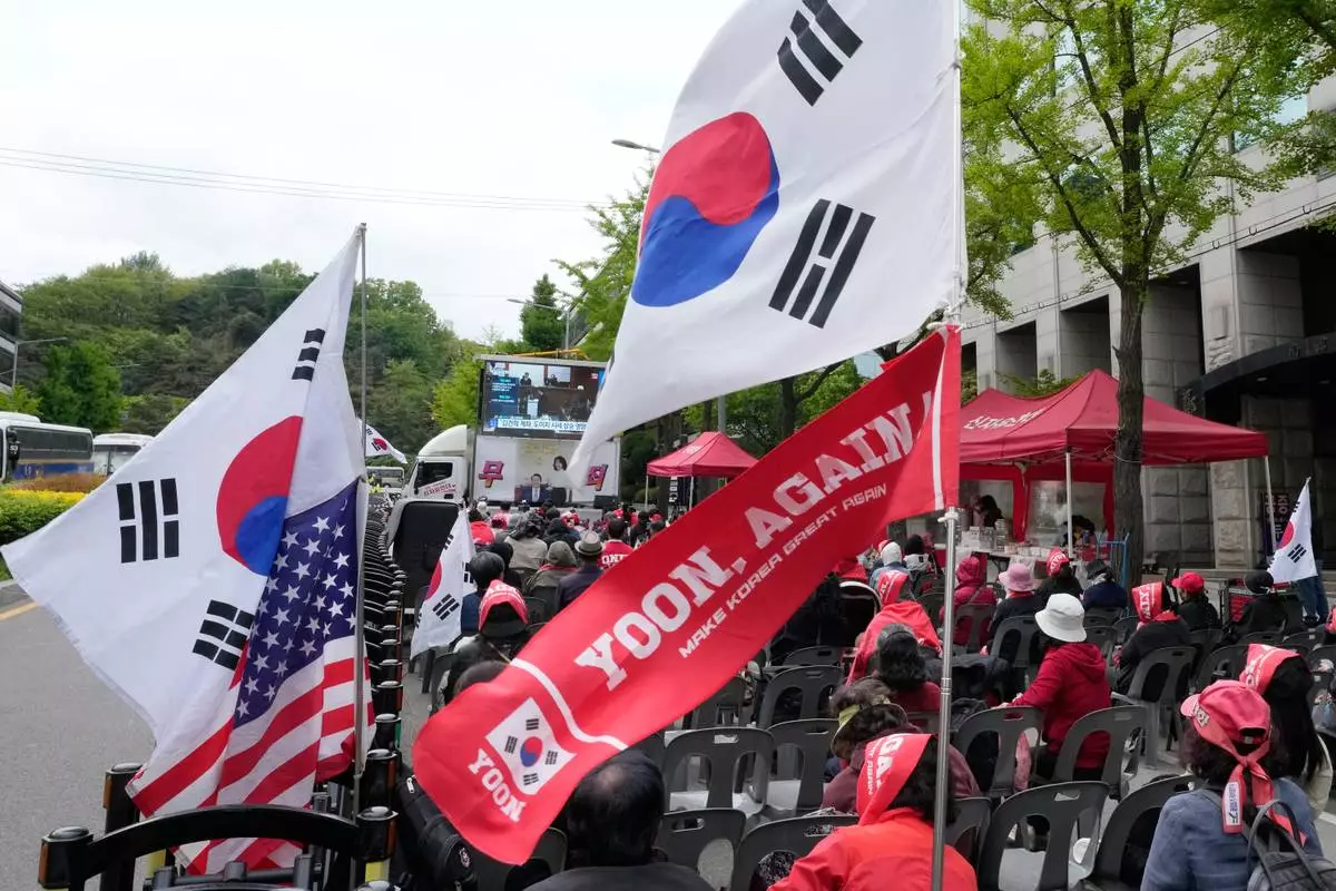 Supporters of former South Korean President Yoon Suk Yeol watch a live TV broadcast that shows his wife Kim Keon Hee attending a hearing during a rally outside of the Seoul High Court in Seoul, South Korea, Tuesday, April 28, 2026. AP Photo/Ahn Young-joon)