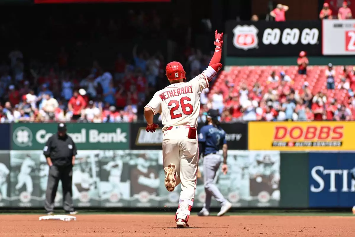 St. Louis Cardinals shortstop JJ Wetherholt reacts as he rounds the bases after hitting a home run against the Seattle Mariners during the first inning of a baseball game, Saturday, April 25, 2026, in St. Louis. (AP Photo/Jeff Le)