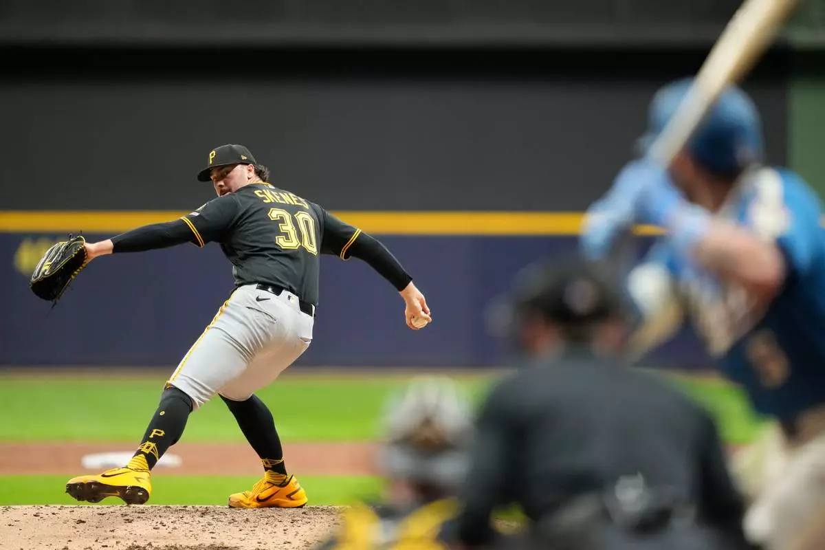Pittsburgh Pirates pitcher Paul Skenes (30) throws during the fifth inning of a baseball game against the Milwaukee Brewers, Friday, April 24, 2026, in Milwaukee. (AP Photo/Kayla Wolf)