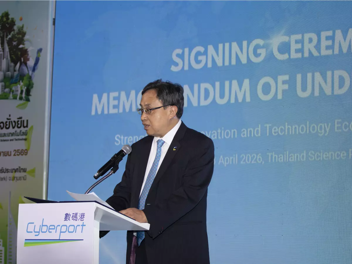 Cyberport today (28 April 2026) signed a Memorandum of Understanding (MoU) with National Science and Technology Development Agency (NSTDA) acting through Thailand Science Park (TSP), to establish a strategic partnership that strengthens innovation and technology (I&T) collaboration between Hong Kong and Thailand. Witnessed by Simon Chan, Chairman of Cyberport and Dr Chularat Tanprasert, Executive Vice President of NSTDA and Director of Thailand Science Park, the MoU was signed by Ir Eric Chan, Chief Public Mission Officer of Cyberport and Professor Dr Sukit Limpijumnong, President of NSTDA.