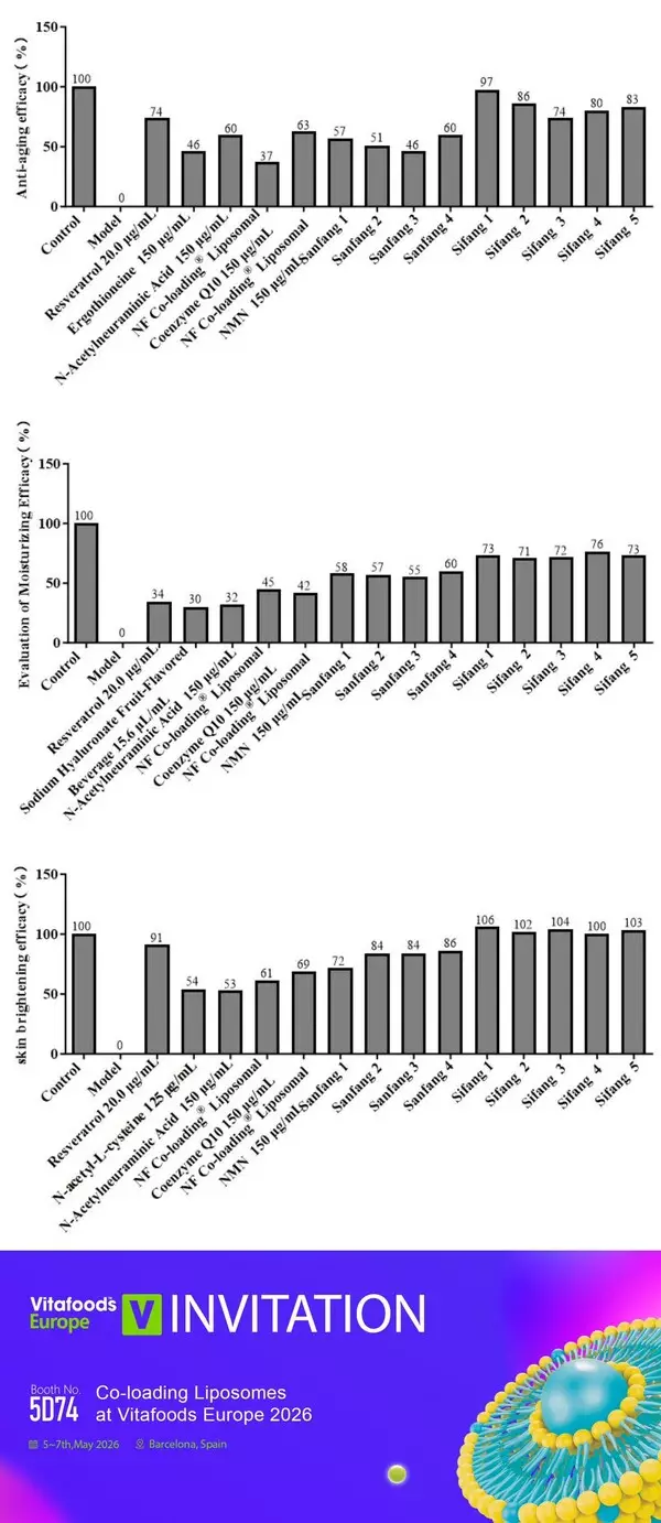 The NMN co-loaded liposome demonstrated better efficacy in brightening skin tone, moisturizing, and anti-aging compared to the use of NMN alone. The coenzyme Q10 co-loaded liposome significantly outperformed the use of coenzyme Q10 alone in various anti-aging indicators, showcasing the tremendous advantages of the liposome delivery system in enhancing ingredient efficacy.