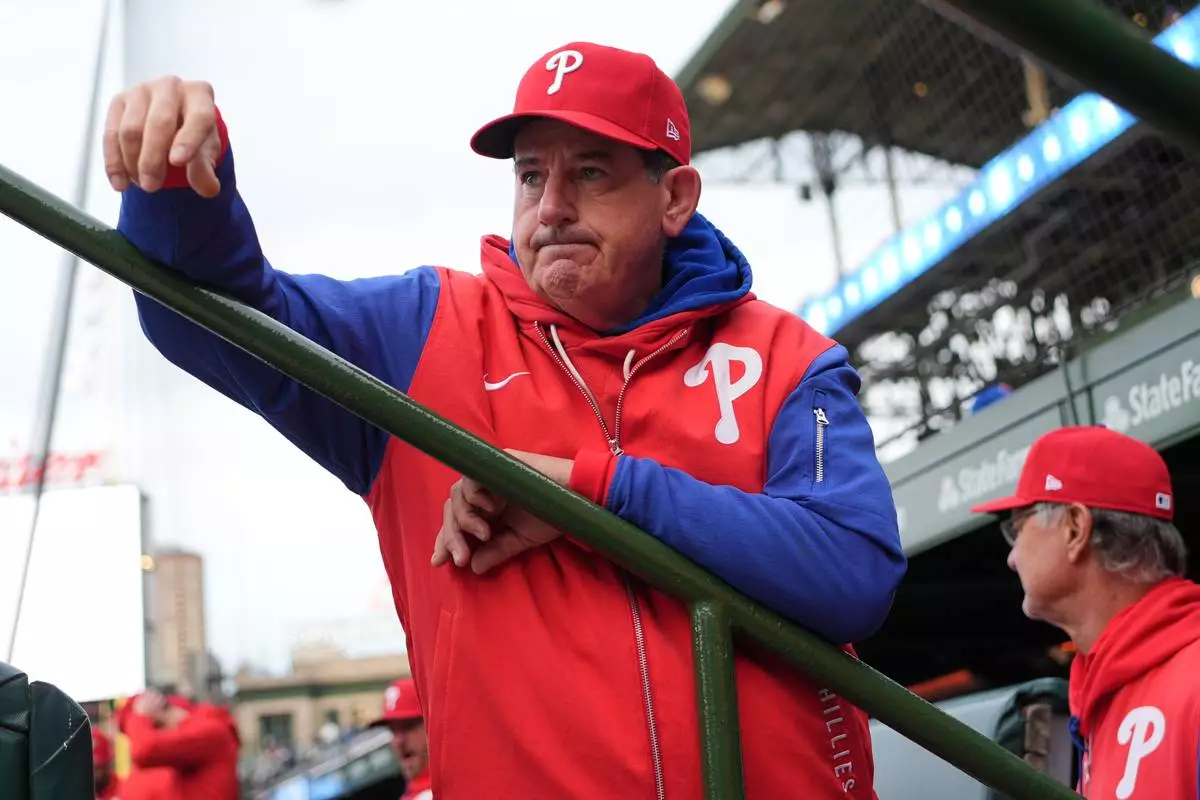 Philadelphia Phillies manager Rob Thomson (49) stands in the dugout before a baseball game against the Chicago Cubs, Wednesday, April 22, 2026, in Chicago. (AP Photo/Erin Hooley)
