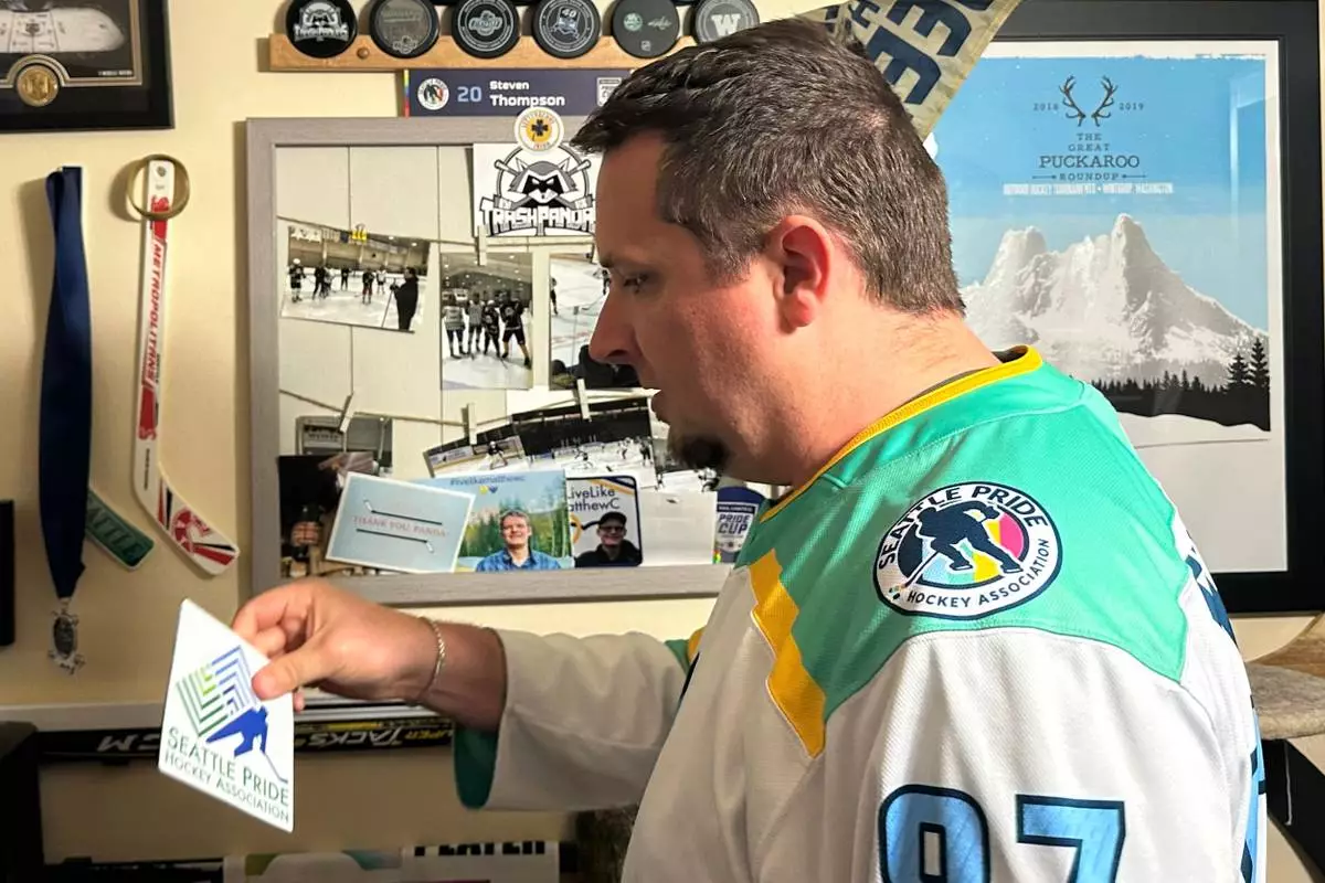 Steven Thompson, co-founder of the Seattle Pride Hockey Association (SPHA), poses for a photo with his stick that features pride tape and a SPHA sweater at his home in Des Moines, Wash., Monday, April 27, 2026. (AP Photo/Andrew Destin)
