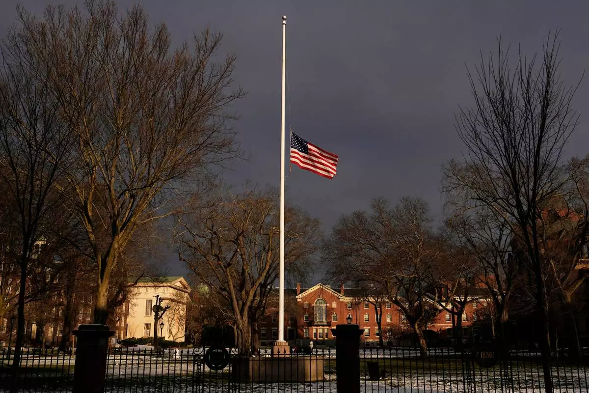 FILE - The U.S. flag flies at half-staff on the Main Green in honor of the victims of the campus shooting at Brown University, Dec. 17, 2025, in Providence, R.I. (AP Photo/Robert F. Bukaty, File)