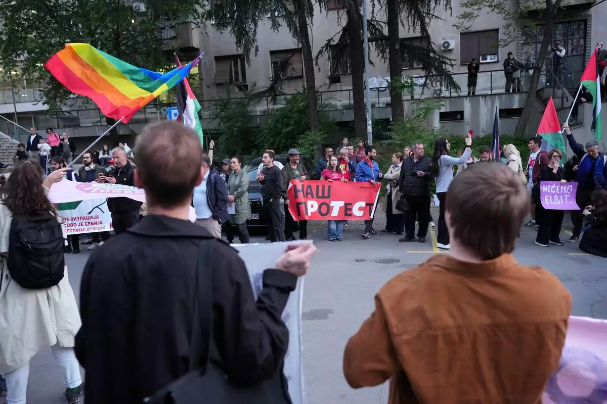 People attend a rally against Israel's participation in the Eurovision Song Contest in front of the state-run TV headquarters in Belgrade, Serbia, Tuesday, April 28, 2026. (AP Photo/Darko Vojinovic)