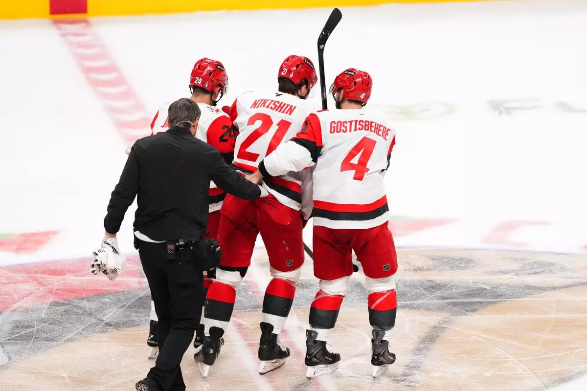 Carolina Hurricanes defenseman Alexander Nikishin (21) is helped off the ice by teammates Seth Jarvis (24) and Shayne Gostisbehere (4) after being checked by Ottawa Senators defenseman Tyler Kleven during the second period of Game 4 in a first-round NHL hockey Stanley Cup playoff series in Ottawa, Ontario, Saturday, April 25, 2026. (Sean Kilpatrick/The Canadian Press via AP)
