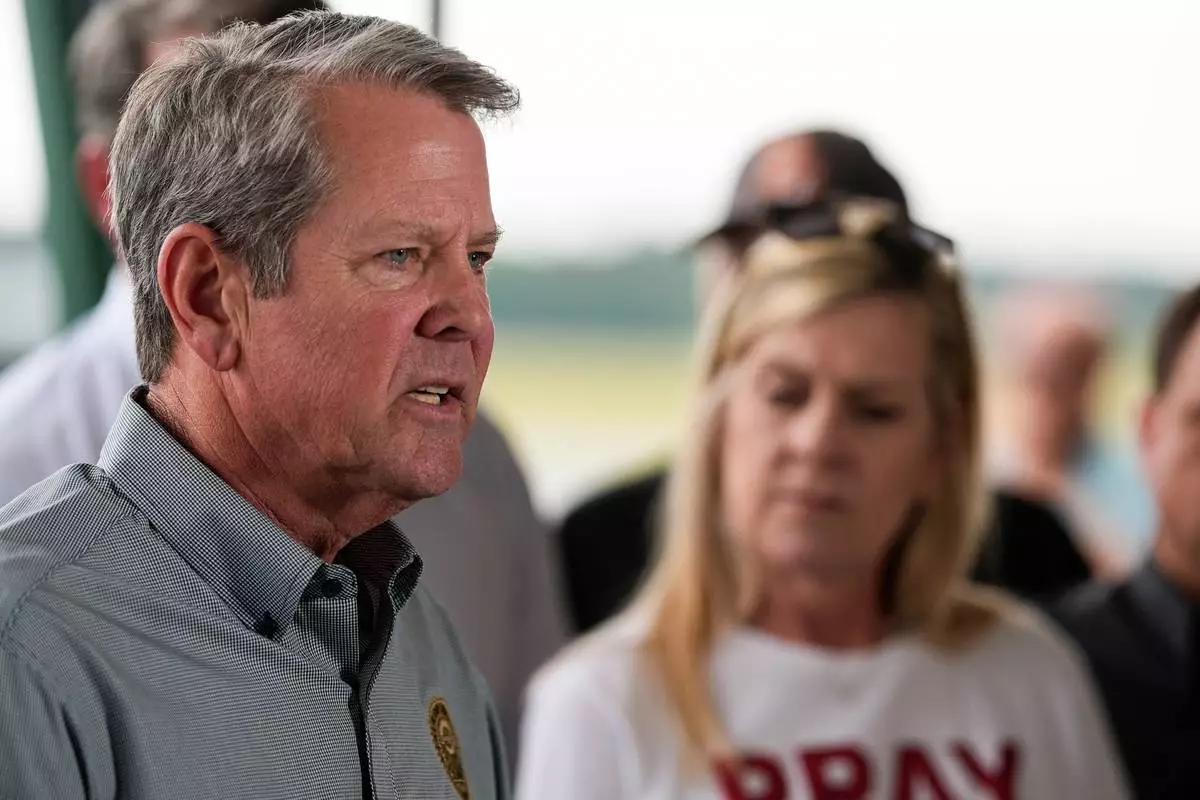 Gov. Brian Kemp speaks on the fires in Southeast Georgia, Friday, April 24, 2026, in Waycross, Ga. (AP Photo/Mike Stewart)