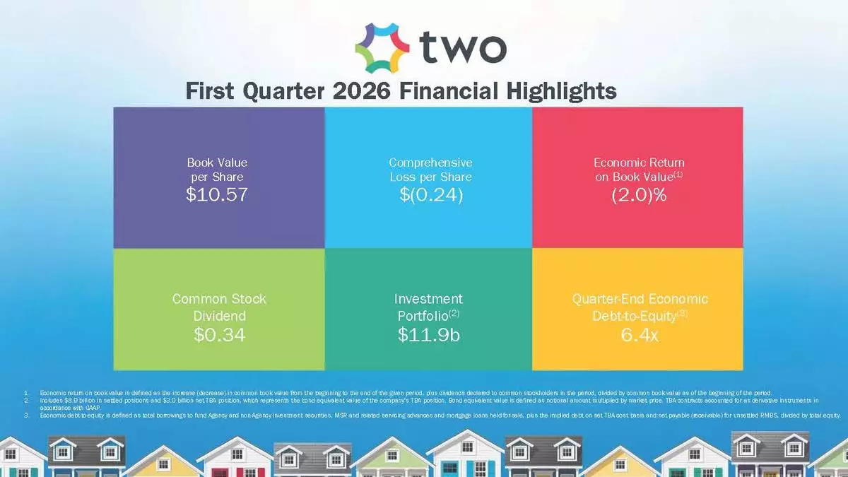 TWO will host a conference call on April 29, 2026 at 9:00 a.m. ET to discuss its first quarter 2026 financial results and related information. To participate in the teleconference, please call toll-free (800) 330-6710 approximately 10 minutes prior to the above start time and provide the Conference Code 1691055. The conference call will also be webcast live and accessible online in the News & Events section of the company’s website at www.twoinv.com. For those unable to attend, a replay of the webcast will be available on the company’s website approximately four hours after the live call ends.
