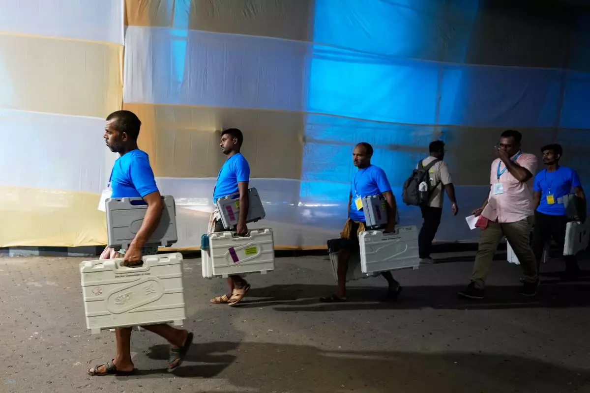 Workers carry Electronic Voting Machines from strong room to a counter at a distribution centre ahead of the second phase of elections in West Bengal state, in Kolkata, India, Tuesday, April 28, 2026. (AP Photo/Bikas Das)