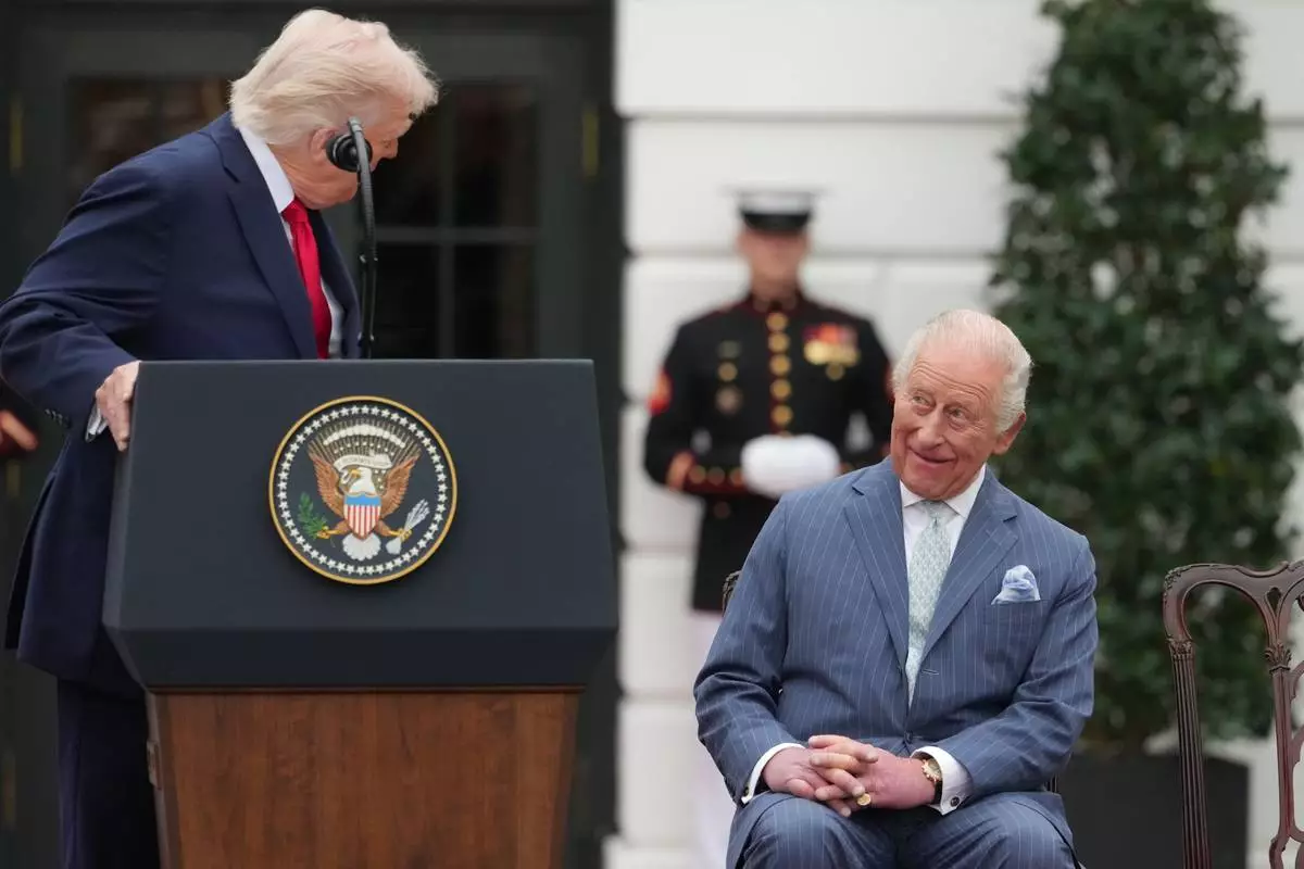 Britain's King Charles III listens as President Donald Trump speaks during a State Visit arrival ceremony on the South Lawn of the White House, Tuesday, April 28, 2026, in Washington. (AP Photo/Alex Brandon)